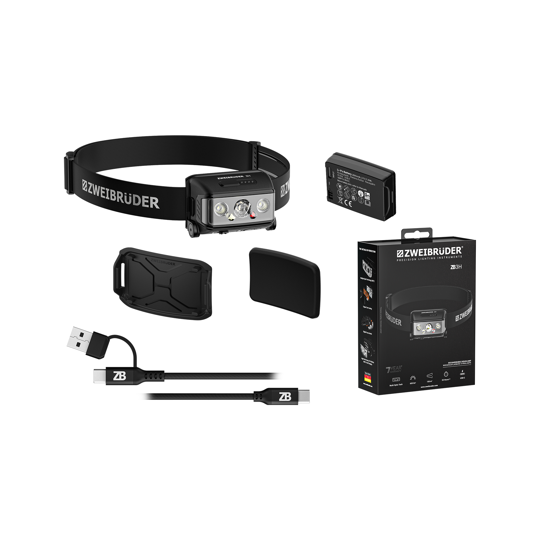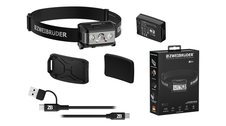 - Scope of delivery ZB3H headlamp, lithium polymer battery, USB-C charging cable, helmet mount, comfort pad