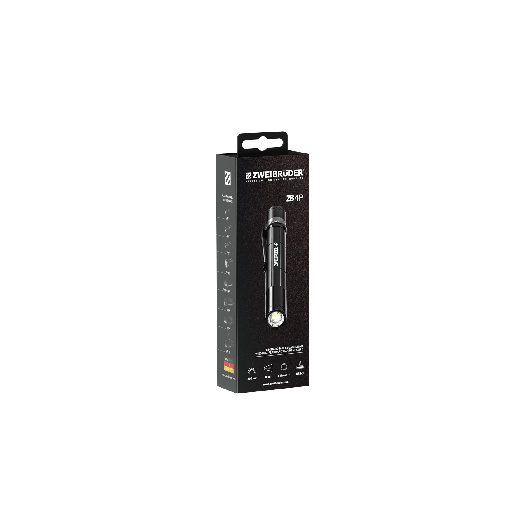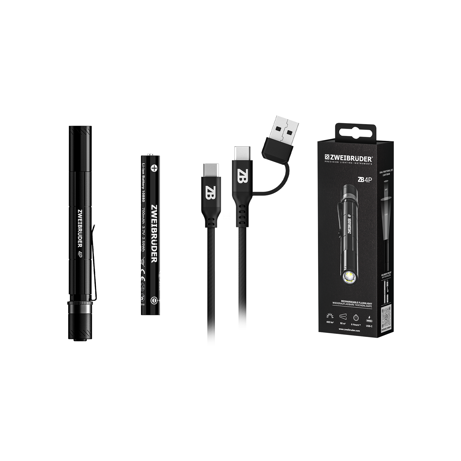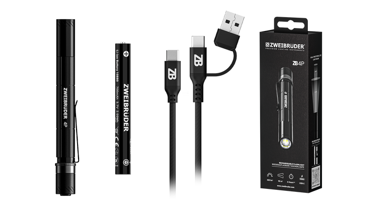 - Scope of delivery ZB4P penlight, 10880 battery, USB-C charging cable, clip