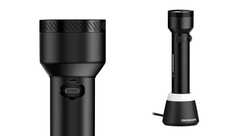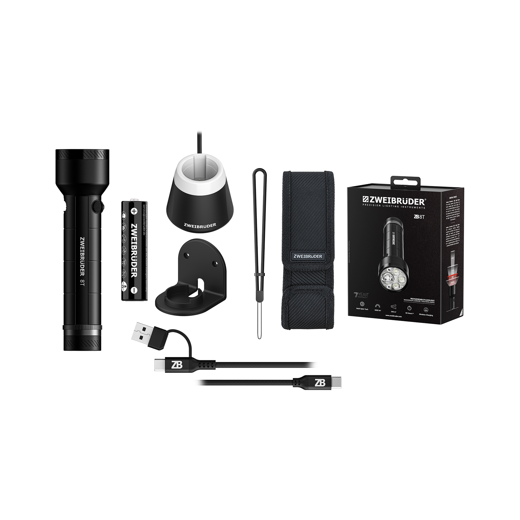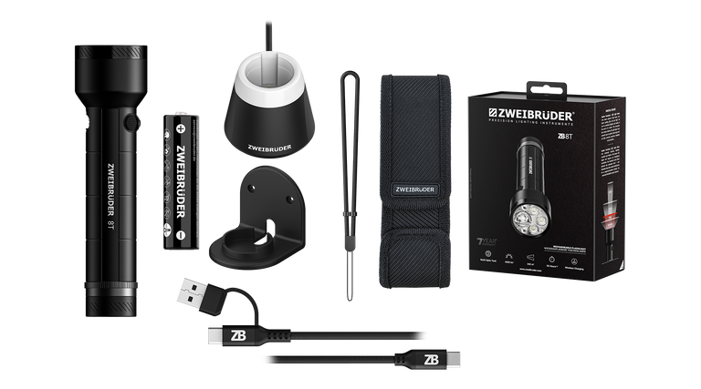 - Scope of delivery ZB8T Torch, 21700 battery, USB-C charging cable, charging station, wall mount, wrist strap, belt pouch