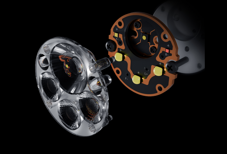 There are four light beams: high beam, floodlight, reading light, and red light. The innovative lens ensures the right light at all times, from powerful high beam to homogeneous floodlight and red light illumination. This guarantees maximum flexibility in every situation.